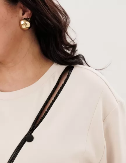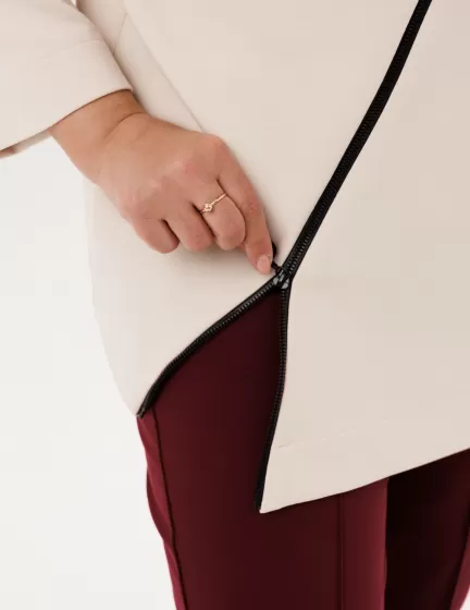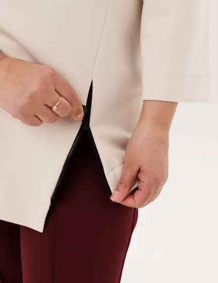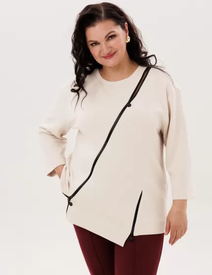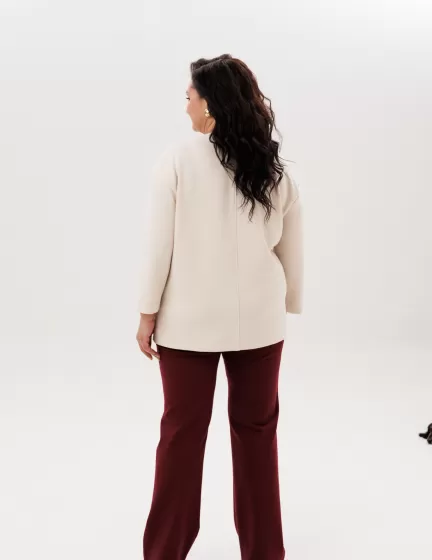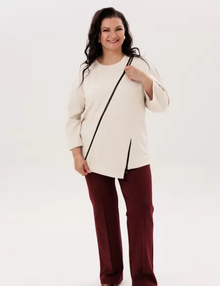 Свободный крой. В лонгсливах «Монамур» бежевого цвета не возникнет неприятных ощущений или дискомфорта. Благодаря умеренному оверсайзу женщина с пышными формами будет чувствовать себя комфортно и свободно.