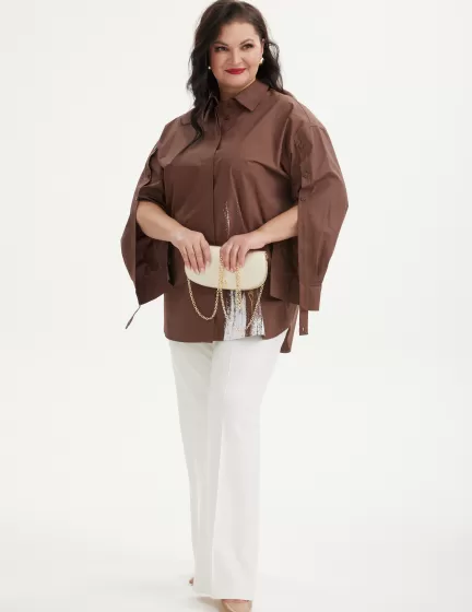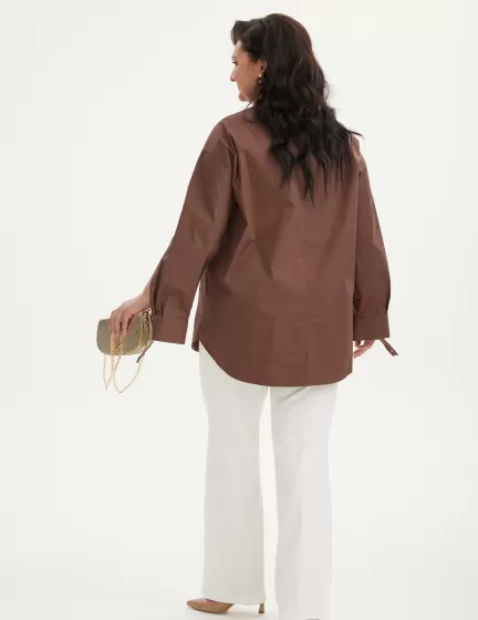 Повседневными. Бренд предлагает множество отличных моделей для спокойного кэжуал образа. Свободные и полуприталенные рубашки коричневого цвета хорошо сидят на женской фигуре, корректируя силуэт.